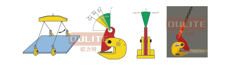 .額定載荷是指吊鉗成對(duì)使用、吊點(diǎn)夾具為60度時(shí)允許起吊的最大重量,吊裝作業(yè)中兩只或4只配套成組使用